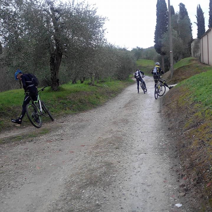 Carissimi Allezziti !!! Stamane i Mitici Tubless Ridi,nonostante il tempo inclemente si sono impegnati in un'altra Avventura,al solito ritrovo si presentano in 4: il Sempregiovane Motobionico !! il Mitico'Uomo Ombra,la Nostra Sicurezza !!! e infine il Senatore,decidiamo di dirigersi verso Montecastello affrontando la salita di S.Andrea,comincia a piovettare entriamo nel bosco tra pozzanghere di fango e sabbia fino ad arrivare al cimitiero di Montecastello,qui il gruppetto si ferma per una breve sosta per annaffiare gli alberi (vedi foto) ripartiamo ed arriviamo in centro al piccolo paese,qui' foto di rito davanti all'albero di Natale,ad un tratto, Renzo alta la testa ed esclama!! ma c'è anche il Presepio? andiamo !! e via su per il paese vecchio con una discreta salita,scendiamo di nuovo e decidiamo di andare a Colleoli,intanto la pioggia si fa sempre piu' battente alcuni si fermano per indossare la mantellina, ma chi ci ferma?dopo qualche km arriviamo ad imboccare la discesa delle Ferrine!! arrivati in fondo inizia lo sterrato di Varramista e qui'arriva il bello!! dopo aver percorso qualche centinaio di metri,il terreno inizia a farsi sabbioso le bici cominciano a derapare a dx e sx fortissimo !!! il fango schizza da tutte le parti un divertimento,arriviamo nella parte sassosa,aumentiamo la velocità e ci tuffiamo in vere e proprie piscine!!! ci voleva il tergicristallo !!! Renzo non si fida ha paura del cortocircuito !!! l'Uomo Ombra invece con la sua macchina da 26 dopo aver studiato il terreno si lancia anche lui sull'acqua!!! il Mitico Meoli sembra planare sopra le gigantesche pozzanghere,il Senatore sembra Tomba !!! in un continuo zig zag ci mancavano solo i paletti !!! arriviamo a Castel del Bosco mentre la pioggia aumenta !!! decidiamo di tirare avanti senza fermarsi per il Mitico Caffè !!! arriviamo alla Rotta deviamo a dx sulla ciclabile fino ad arrivare alla Mitica salitella che ciriportera' sulla strada,qui a Renzo gli si ingolfa la moto !! prorio in salita rimane in surpless per qualche secondo poi deve arreendersi portandandola a piedi fino in cima!! risate a crepapelle!! le battute si sprecano !!Mitici !! arriviamo a Ponsacco bagnati ma soddisfatti del percorso,tra battute e sfotto' non abbiamo sentito nemmeno l'acqua divertimento assicurato!! Grazie Ragazzi anche questa volta avete dimostrato il vero spirito dei Tubless Ridi !! siete stati Esagerati !! alla prossima Allezziti !!