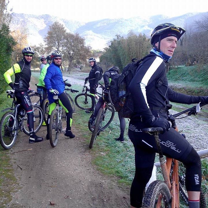 Grande uscita stamane dei Mitici Tubless Ridi !! la meta:la Verruca da Montemagno!! stessa ora stesso ritrovo,puntuali come un orologio Svizzero !!! si presentano diversi Atleti malgrado il freddo pungente !!il gruppo si dirige verso Pontedera per incontrare il Mitico Mario e sua Santità!!arriviamo ai piedi della Mitica salita di Montemagno e qui' ogniuno prende il suo ritmo,il percorso appare subito impegnativo,l'scesa è senza respiro !! fino al paese dove a dx imbocchiamo il sentiero che ci portera' alla Verruca !!! dopo pochi metri affrontiamo le prime rampecon una pendenza al 17-18% non male !! inizia il vero sterrato,con i fatidici tornanti di cemento!! la pendenza in certi tratti arriva quasi al 20% ma nessuno molla !! denti stretti e via !! di tanto in tanto possiamo ammirare il bellissimo panorama della Val Graziosa!! arriviamo in Verruca sembrava d'esse in Corso Italia !!! centinaia di appassionati con la MTB si erano dati appuntamento per il classico Panettone !! c'erano decine di Babbi Natale !!!perfino la slitta con i doni Spettacolo !! ci fermiamo per salutareil Mitico Gianfranco !!! ad un tratto ci accorgiamo che Fabry non c'era !! lo cerchiamo per qualche minuto poi decidiamo di chiamare la Forestale !!! s'è sperso da camera a cucina Incredibile !! riprendiamo il nostro percorso imboccando la Mitica Tagliata,qui' la classica foto di gruppo con uno scenario Unico!!ci dirigiamo verso la discesa di San Jacopo, galleggiamo sulle pietre, zigzagando per cercare la traiettoria ideale !!! intanto il Mitico cameramen ci immortala !! tra i tornati della discesa,arriviamo a Vicopisano,un po' stanchi ma soddisfatti, anche per oggi i Mitici Tubless Ridi si sono superati!! sempre con lo stesso spirito che li contraddistingue!!! divertirsi,ridere affrontando scenari mozzafiato con la consapevolezza di essere un Gruppo Unito ed Unico !! Grazie Mitici mai nessuno come Voi un saluto Allezziti alla Prossima !!